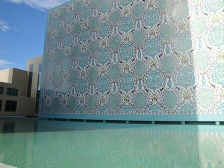 Toufik conçoit une fresque monumentale de 2 060 m² composée de 52 000 pièces de faïence peintes à la main, installée sur la façade ouest du Centre des Conventions Mohamed Benahmed à Oran.
